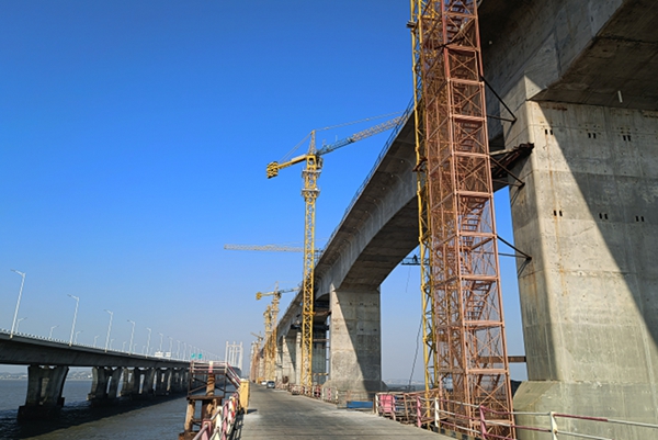 在泉州灣碧海藍(lán)天下,有著陜建機(jī)股份顯著標(biāo)識(shí)的大型塔機(jī)與貝殼形曲線橋塔緊緊相連巍然屹立,主體輪廓已顯的高鐵大橋與相鄰的高速公路大橋猶如兩條巨龍盤踞海面,蔚為壯觀。